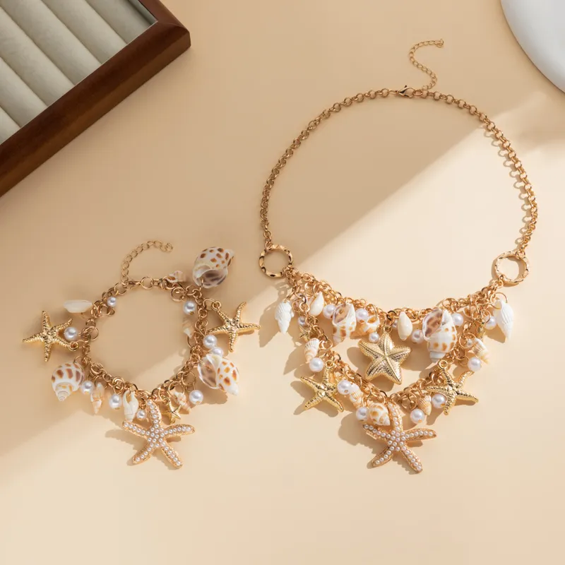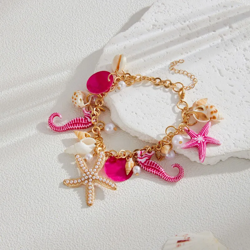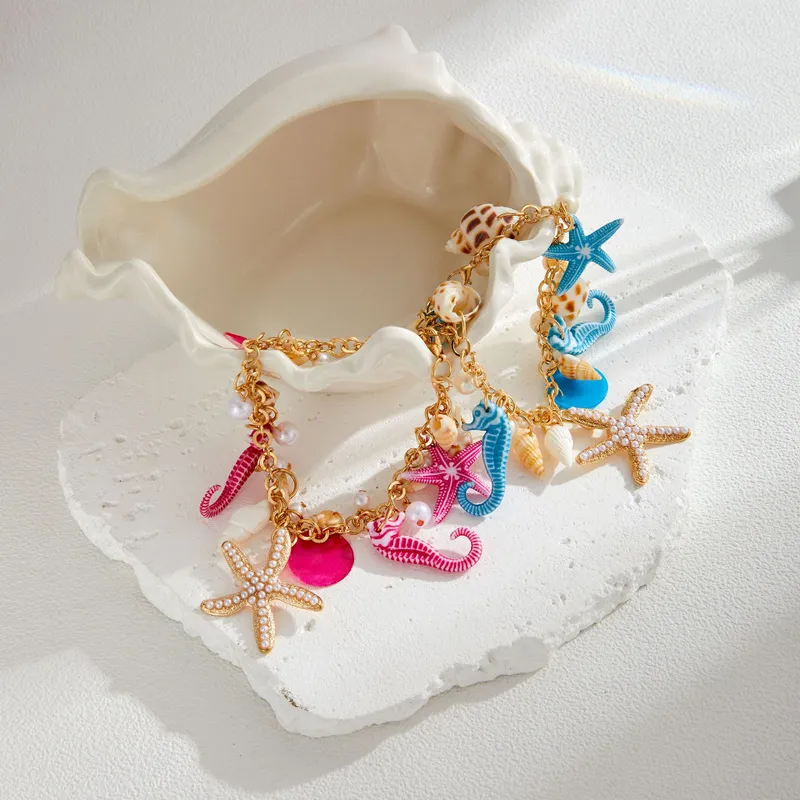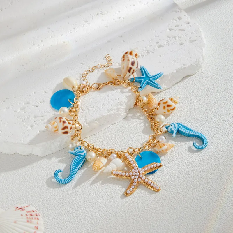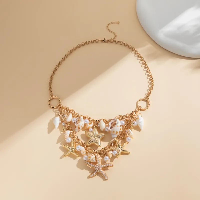 Adorned with cute starfish, seashells, and seahorse charms, this playful piece is made from lightweight alloy with a gold-tone finish. The charms are accented with colorful resin and plastic pearls, giving it a whimsical beach vibe. Perfect for those looking for an affordable, statement accessory that captures the essence of the sea.